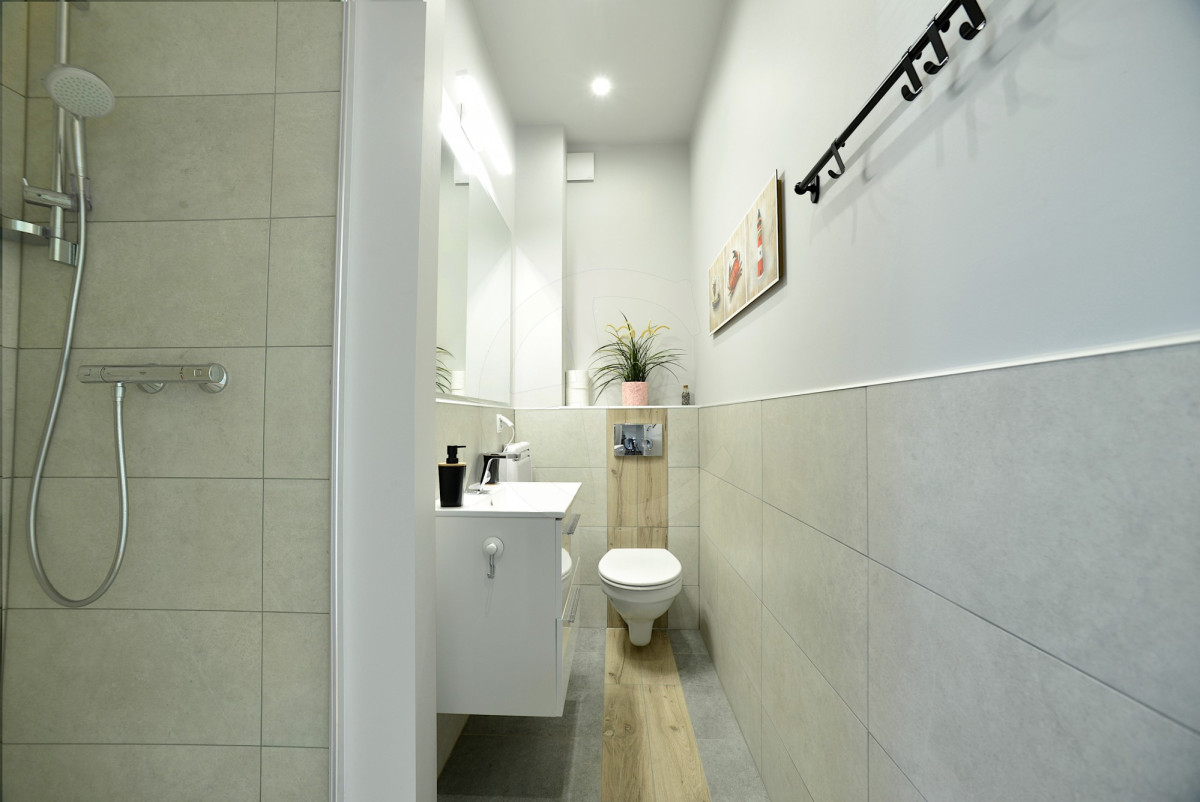 - aneksu kuchennego w pełni wyposażonego w sprzęt AGD (lodówka z zamrażarką, płyta elektryczna, piekarnik, zmywarka, okap, pralka i mikrofalówka),